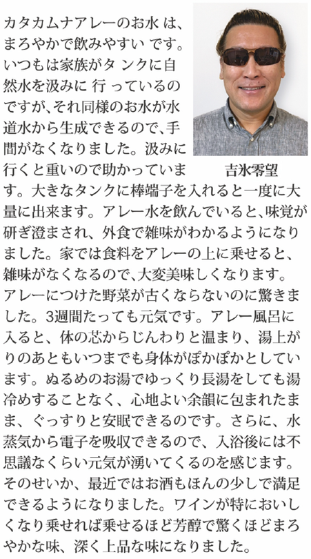 そこにテレビアンテナ産みの親、電波技術のパイオニア・八木秀次 (やぎひでつぐ) 先生の電波の技術を重ね、作られた電子水生成器AREE(アレー)に、長谷川淨潤先生からカタカムナエネルギーを注入いただき、バージョンアップ!